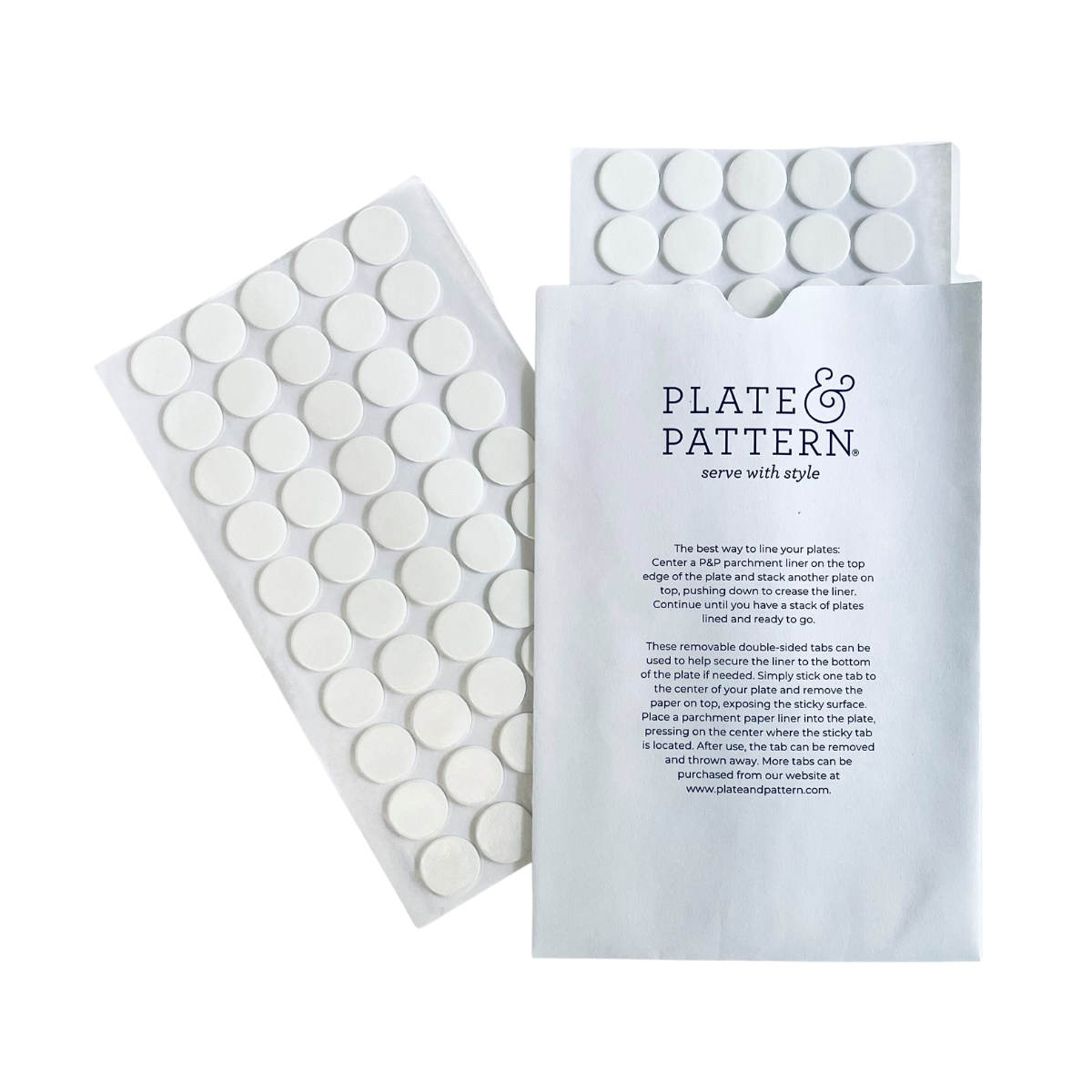 These removable double-sided tabs can be used to help secure liners to the bottom of our metal and white metal plates when needed. We love to use them when setting a table in windy conditions.